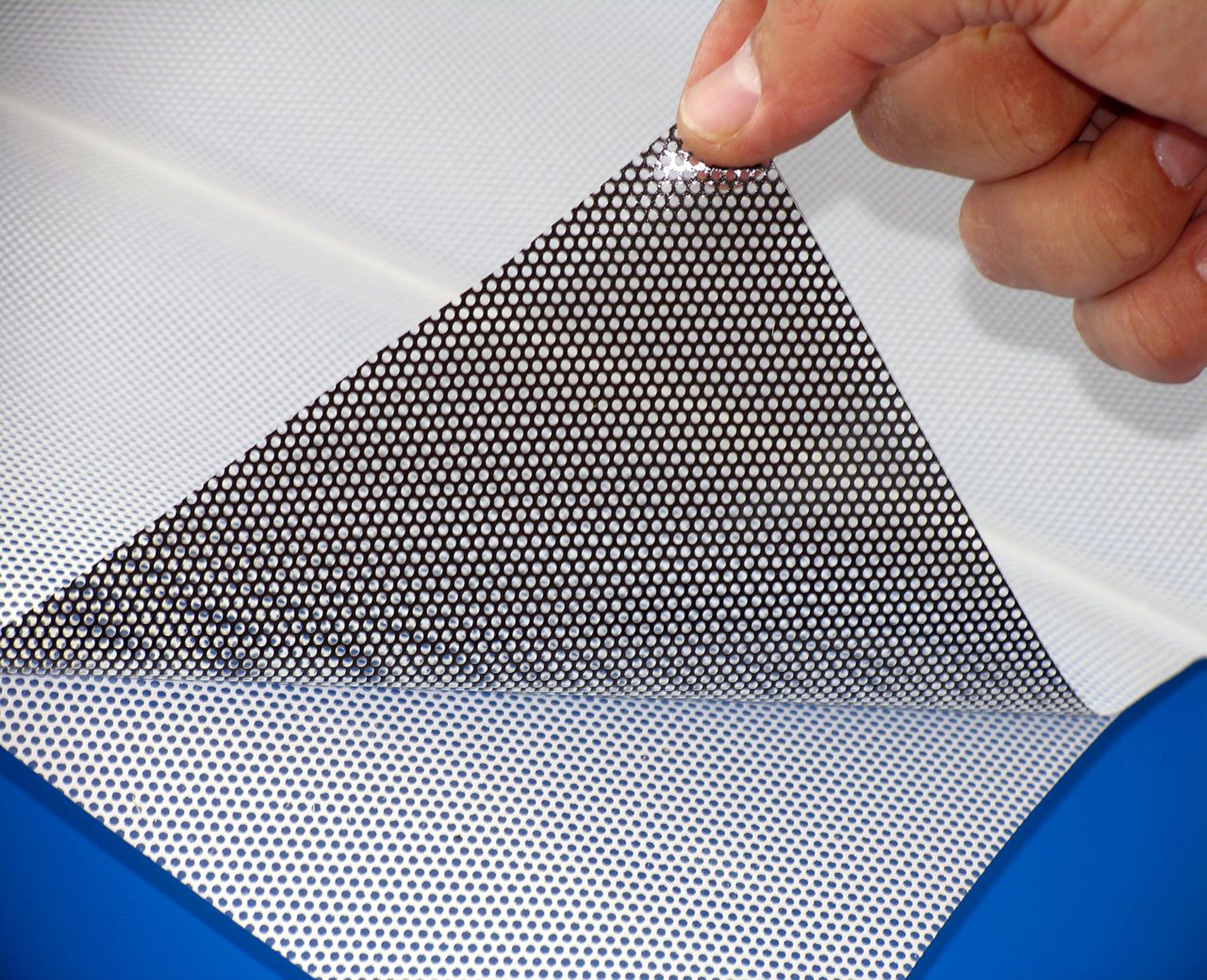 Перфорированная пленка представляет собой ПВХ-пленку с клеевым слоем и перфорационными отверстиями, занимающими до половины всей ее площади. Перфорированная пленка используется для оклейки стекол маршрутки.